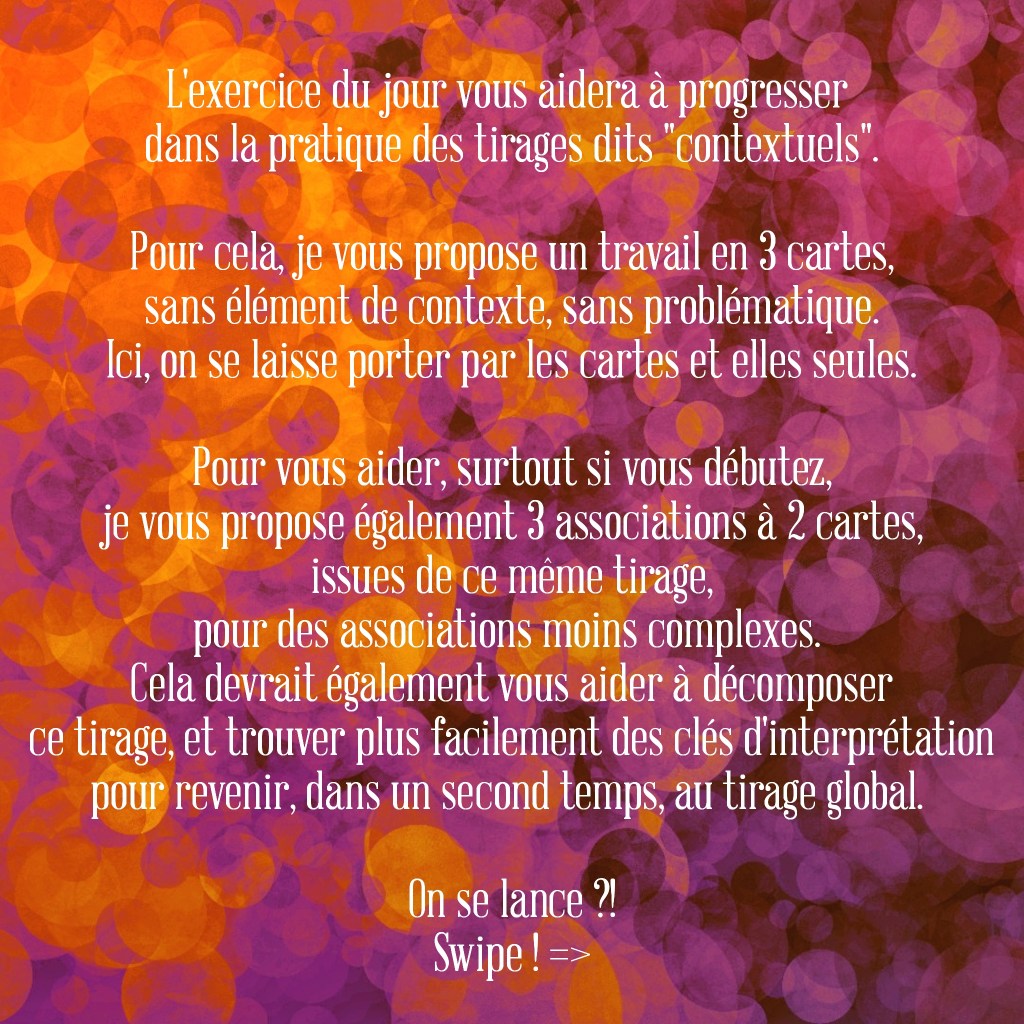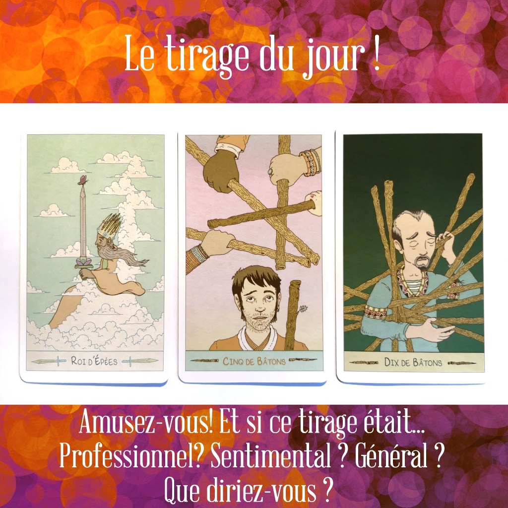 J’ai fait le choix, pour cet exercice, de ne pas vous soumettre de question préalable au tirage, pour vous laisser une liberté pleine et entière, alors sentez-vous libre de faire une analyse générale du tirage, mais également de lui donner, si cela vous aide, une orientation sentimentale, professionnelle, de santé, etc.