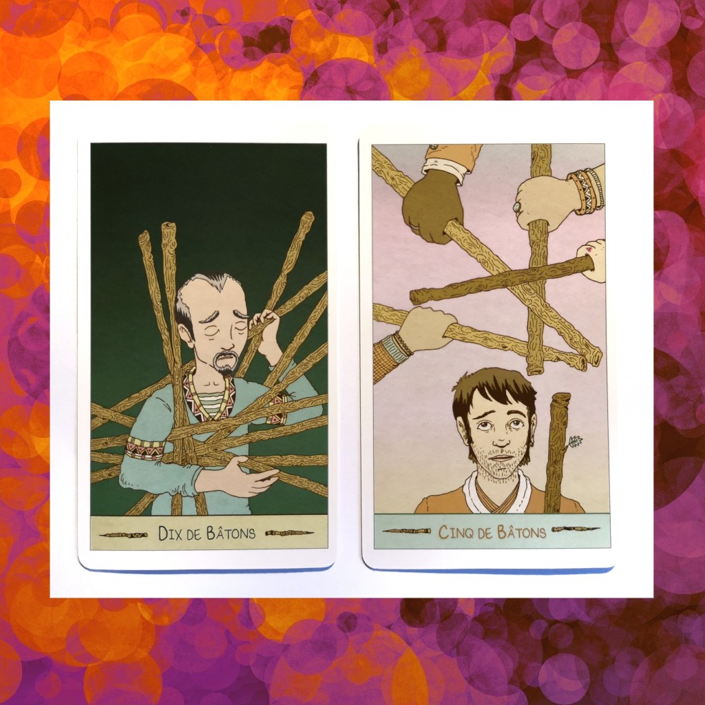 - On tient compte des similitudes dans les cartes (combien de majeurs ? De mineurs ? Combien de Coupes ? De Bâtons ? Quelle position pour les personnages ? Que font-ils ? Que regardent-ils ? Se tournent-ils le dos ? Est-ce qu’il y a un ou plusieurs personnages ? Se ressemblent-ils ?).