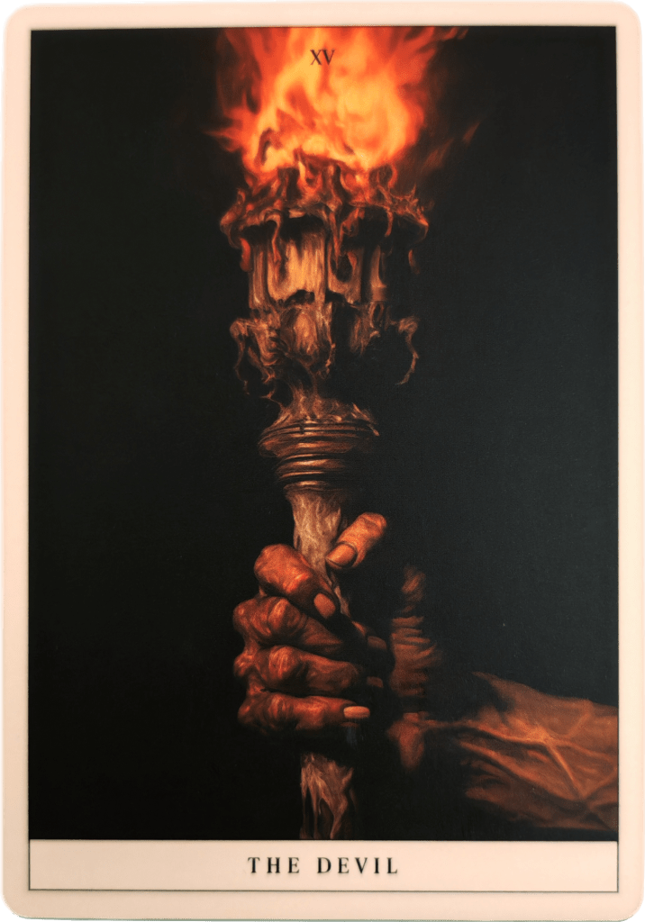 Cette carte évoque non seulement ce qui nous attache et nous entrave (nos addictions, nos obsessions, nos sentiments, les chaines du matérialisme…), mais également les comportements que cela induit vis-à-vis de nous-mêmes ou des autres (désespoir, pulsions, méchanceté, influence, manipulation, domination). Cette carte ne parle pas de rationalité, elle parle de céder à des besoins, des envies, des désirs primaires, sans penser aux conséquences pour soi ou pour les autres.