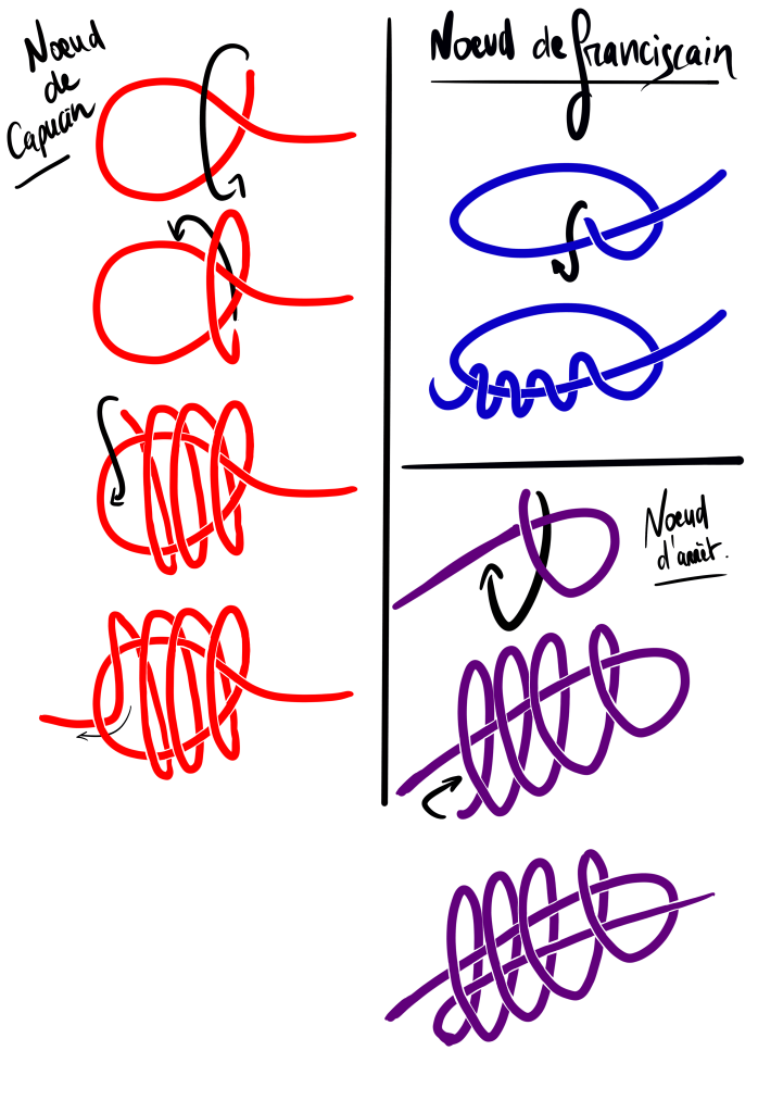 La variété de noeuds que l’on peut utiliser est immense, mais voici les noeuds “de base” avec lesquels je vous propose de vous entrainer pour la réalisation, parce qu’ils seront les plus simples et efficaces pour vos rituels :