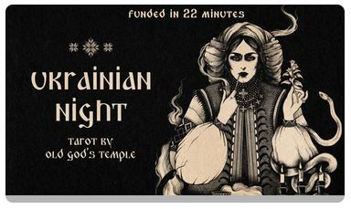 - « Ukrainian Night Tarot by Old God’s Temple », de Mariya Tobischek (Autriche) = celui là est normalement produit et j’ai rempli le « surveykit » pour les frais d’envois, j’espère le recevoir bientôt bien que je n’ai pas de nouvelles depuis début janvier !